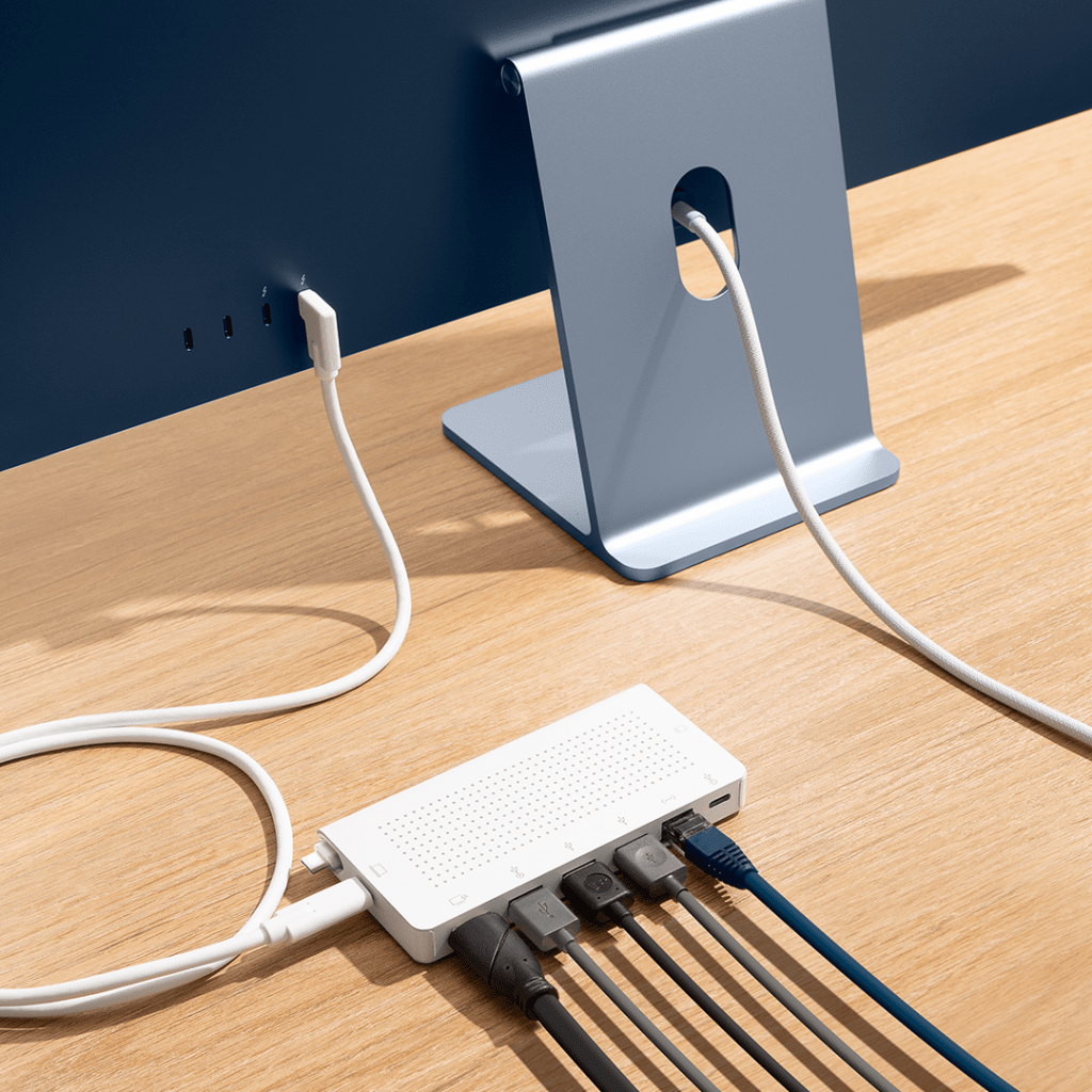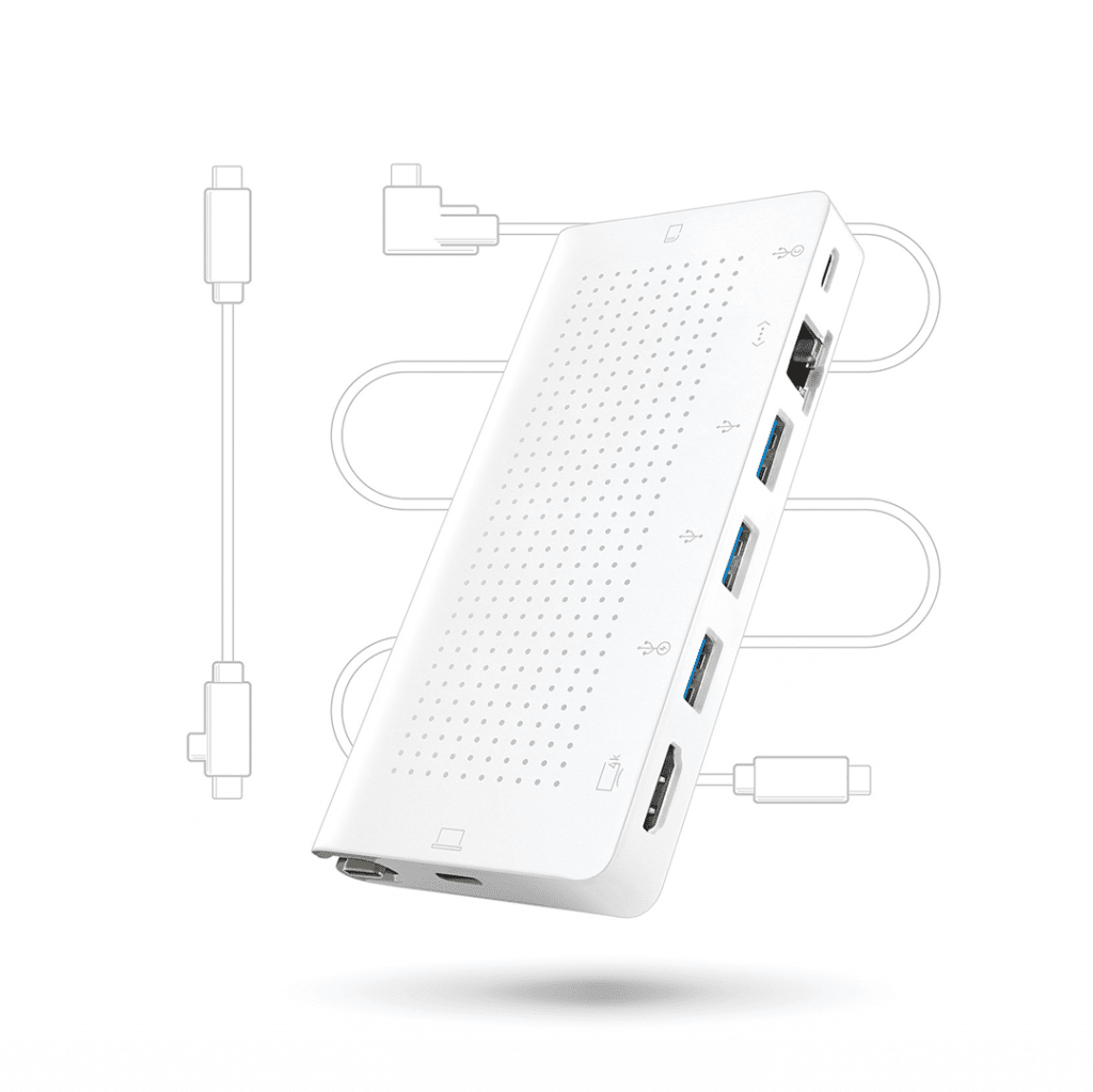 USB-C hubben med en 1-meters skrivebordskabel og opbevaringsbar rejsekabel