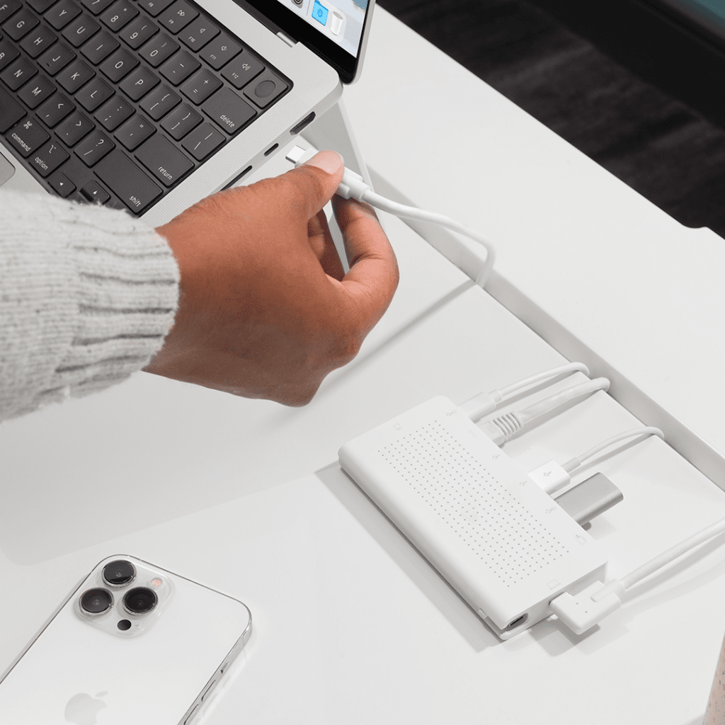 StayGo er en bærbar hub med alle dine foretrukne porte og forbindelser til Mac. Oplad din iPhone, download billeder fra et SD-kort, tilslut en ekstern skærm og mere. Denne hub har en praktisk 1-meters kabel, der holder alle kabler ud af syne for en ryddelig arbejdsplads. Arbejder du på distancen? Skift til StayGo's kompakte rejsekabel, der bekvemt er opbevaret inde i hubben, som er helt i metal. Uanset hvor dit arbejde tager dig hen, kan du nu blive og gå let og bekvemt.
