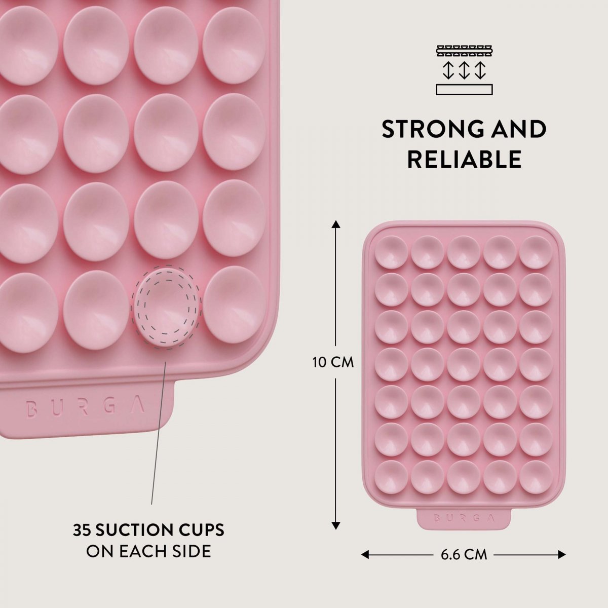 StickPad er BURGAs klæbrige greb, som gør multitasking til en selvfølge. Takket være 35 sugekopper på hver side kan den holde din telefon fast på glatte, ikke-porøse overflader i op til 3 timer på blanke overflader og op til 1,5 timer på halvblanke overflader.