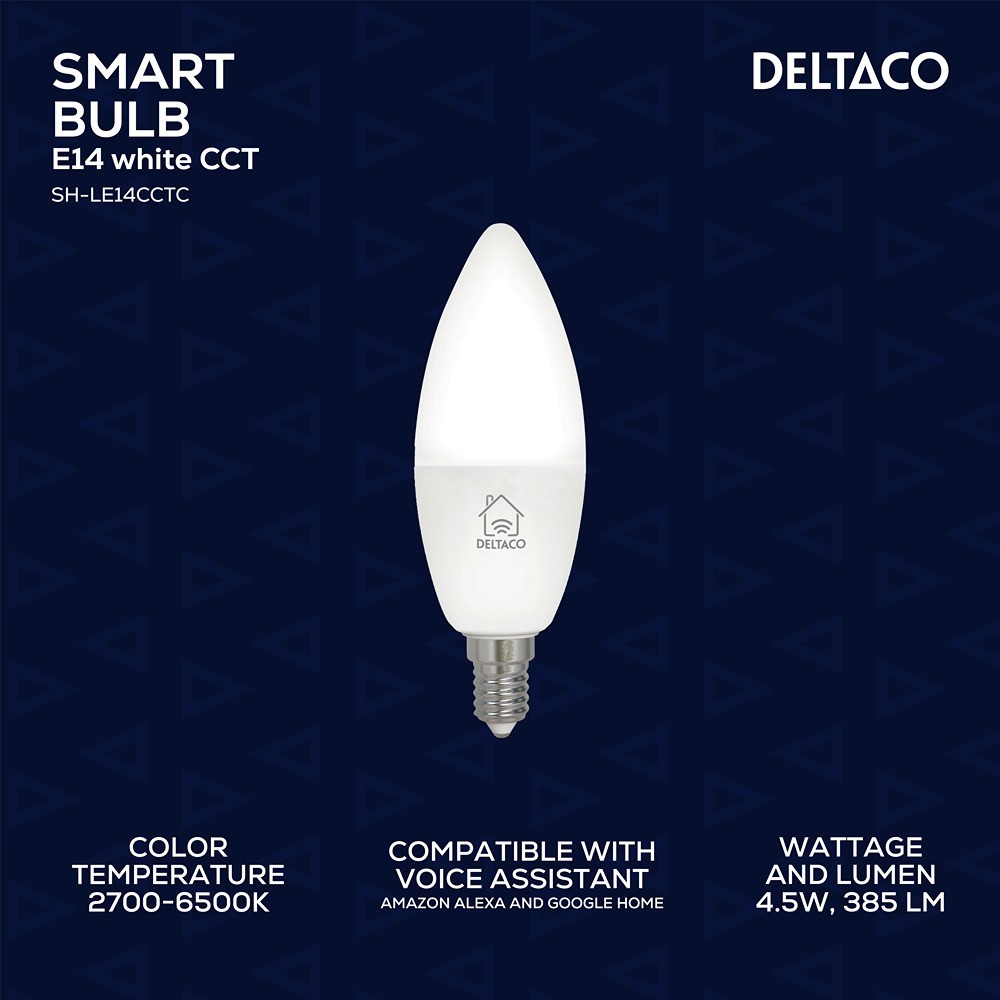 Med DELTACO SMART HOME-appen kan du styre alle funktioner for lampen. Installation er hurtig og glat; alt hvad du behøver, er et fungerende trådløst netværk, dvs. ingen specielle hubber eller gateways. I DELTACO SMART HOME-appen kan du styre individuelle lamper separat eller gruppere dem i forskellige rum for nem styring af en gruppe af lamper. Udover at tænde eller slukke for en lampe kan du også indstille en timer, hvis du ønsker, at lampen skal slukke efter et bestemt tidsrum. Alternativt kan du planlægge specifikke tidspunkter for, hvornår den skal være tændt eller slukket. DELTACO SMART HOME-appen tilbyder også muligheden for at oprette automatiske handlinger, såsom at få lampen til at tænde, når solen går ned, eller hvis du vil gruppere flere lamper til at udføre den samme handling på et givet tidspunkt. DELTACO SMART HOME-appen er selvfølgelig tilgængelig til gratis download til både Android og iOS.