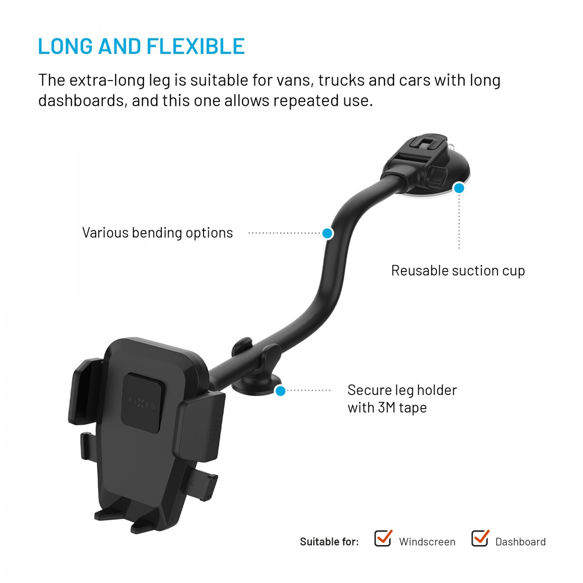 Materialet i holderen er en kombination af hærdet plast og beskyttende silikoneelementer, der danner en enhed. Den fleksible arm kan placeres på forruden eller instrumentbrættet ved hjælp af en sugekop. Sugekoppen tåler alle stød og mister ikke sit stærke greb, selv efter gentagen montering. Den fleksible arm, som er op til 29 cm lang, giver en ideel synsvinkel, som kan bøjes efter behov eller fastgøres med et ekstra håndtag ved hjælp af stærk 3M tape. Kabelorganisering lettes af aftagelige håndtag på bagsiden af holderen. Med FIXED Iconiq Flex XL-holderen kan du nyde hver kørsel uden bekymringer.