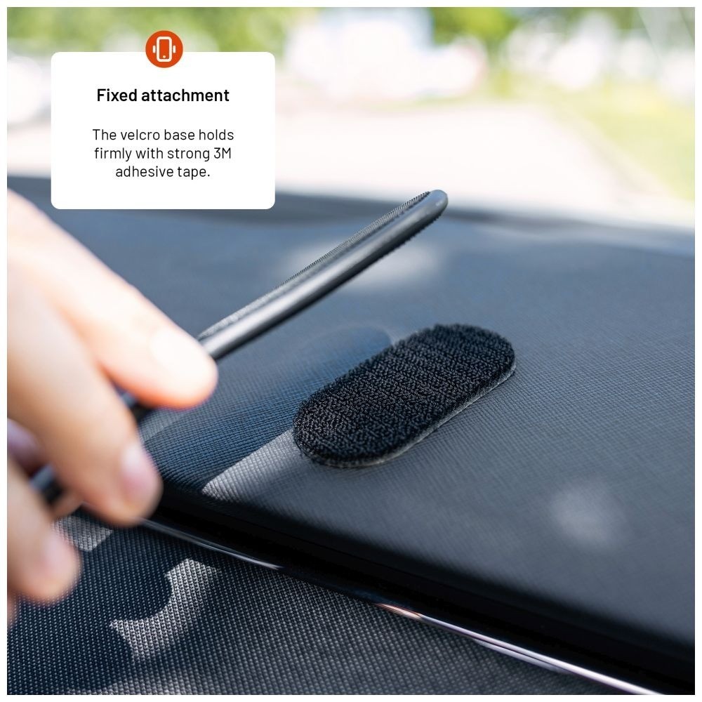 Takket være velcro-remmen, der fastgøres med 3M tape, kan holderen placeres på enhver overflade i bilen, derhjemme eller på kontoret, og holderens fleksible arm kan justeres til den optimale position.