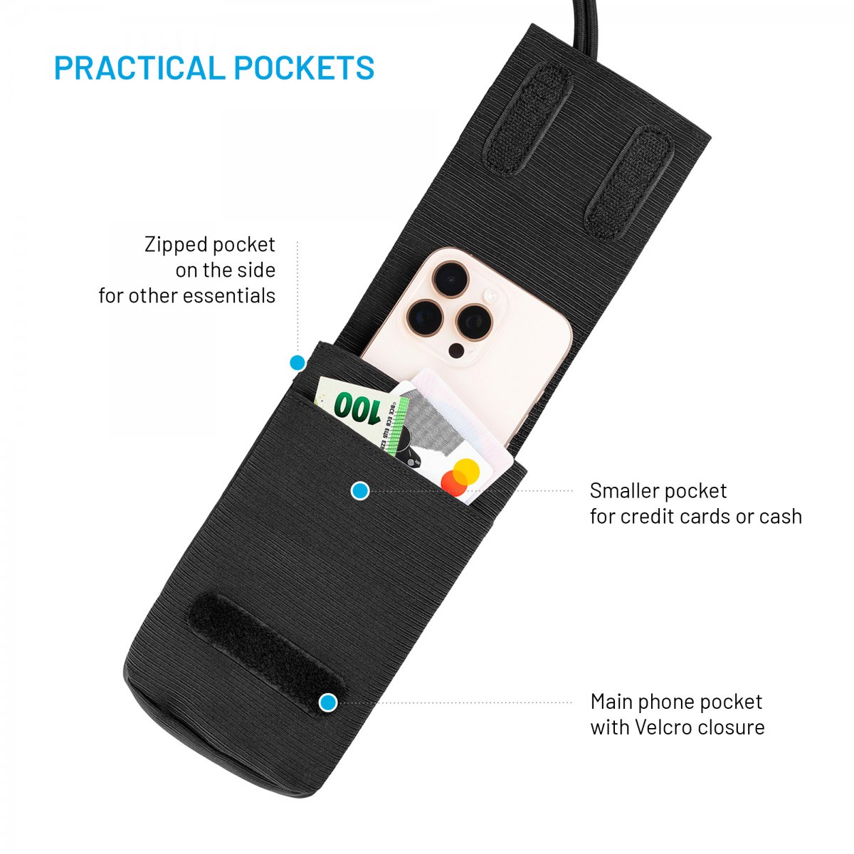 Det primære rum holder en mobiltelefon på op til 7 tommer og er beskyttet af en klap med en Velcro-lukning sammen med frontlommen.