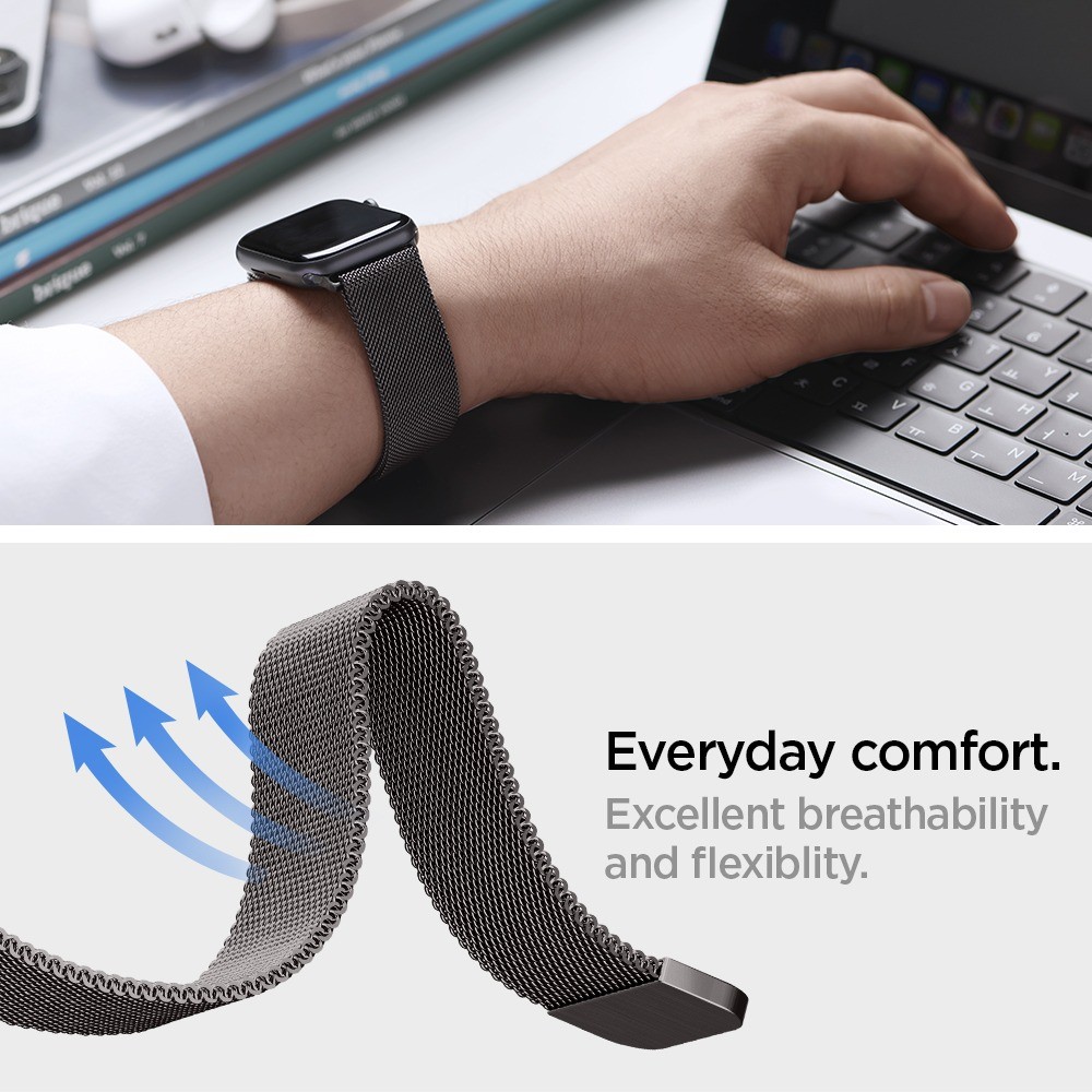 Spigen Apple Watch 44/45/46mm/Ultra 49mm Armbånd Metal Fit Graphite er et gråt armbånd til Apple Watch 44mm, Apple Watch 45mm, Apple Watch Ultra 49mm og Apple Watch 46mm.