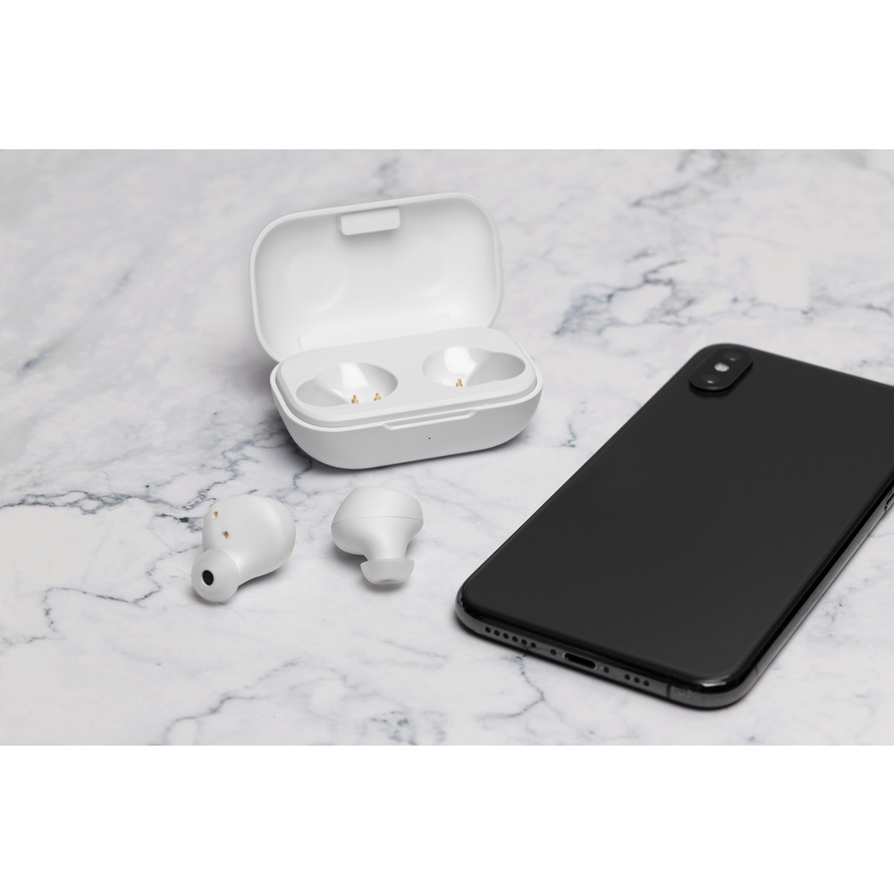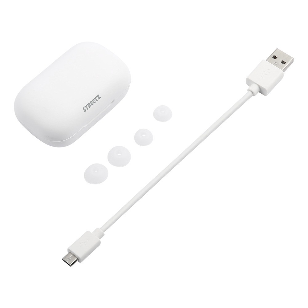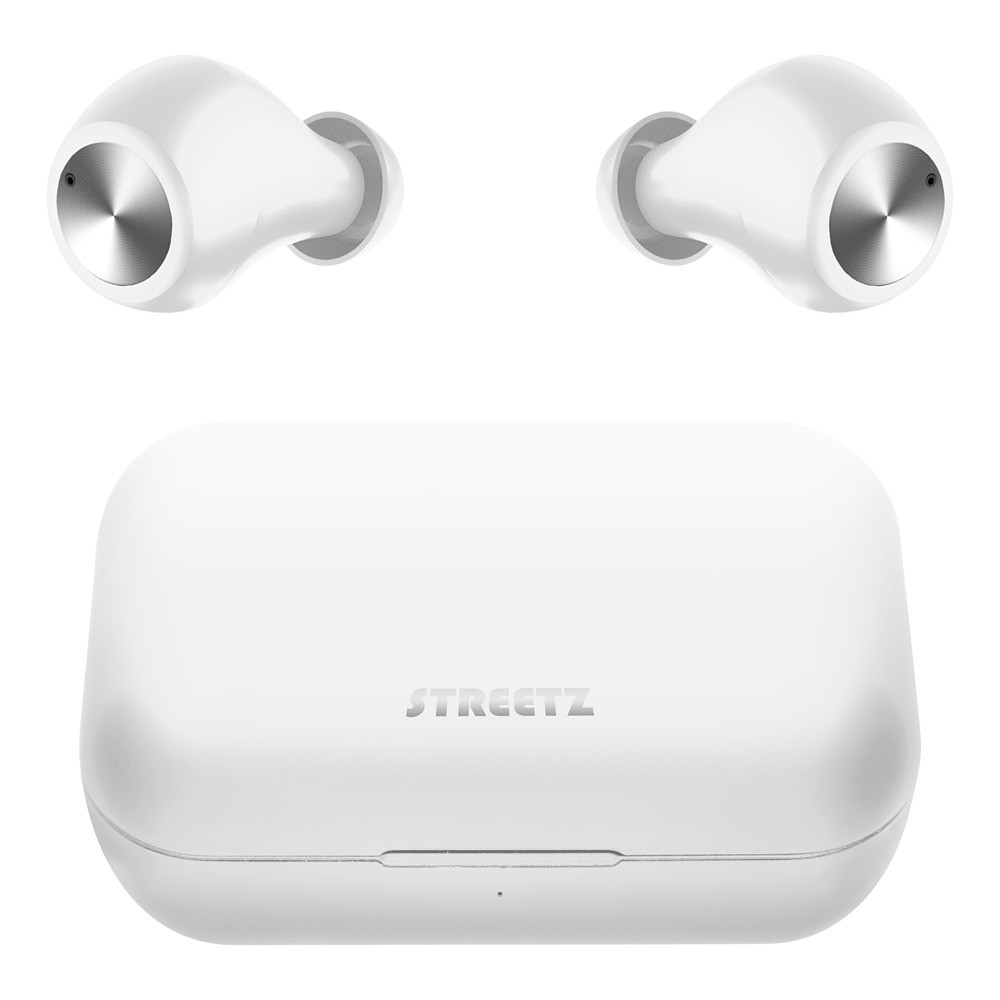 Trådløse TWS-øretelefoner fra STREETZ med mikrofon, opkalds-/mediaknapper, Bluetooth 5 med 10 m rækkevidde og en ergonomisk pasform til behagelig lytning i op til 16 timer med den medfølgende opladningsetui.
