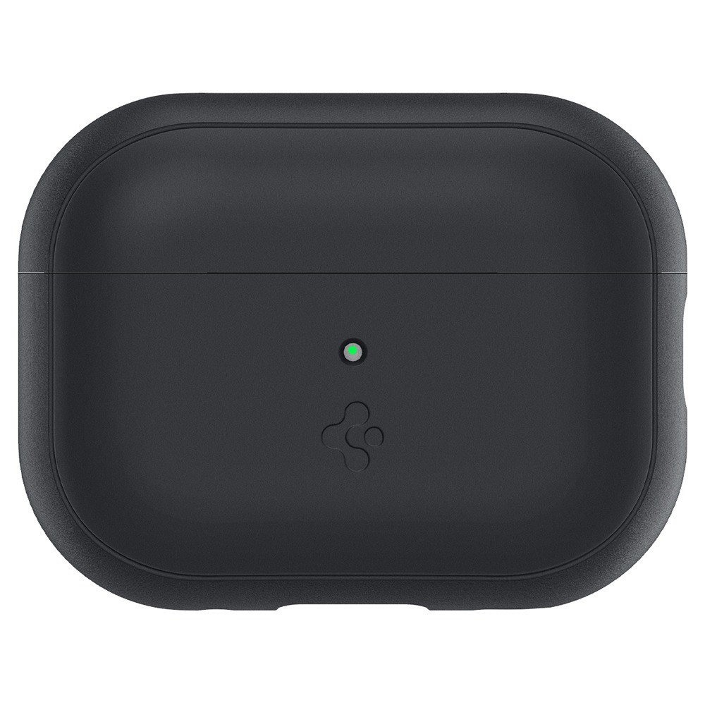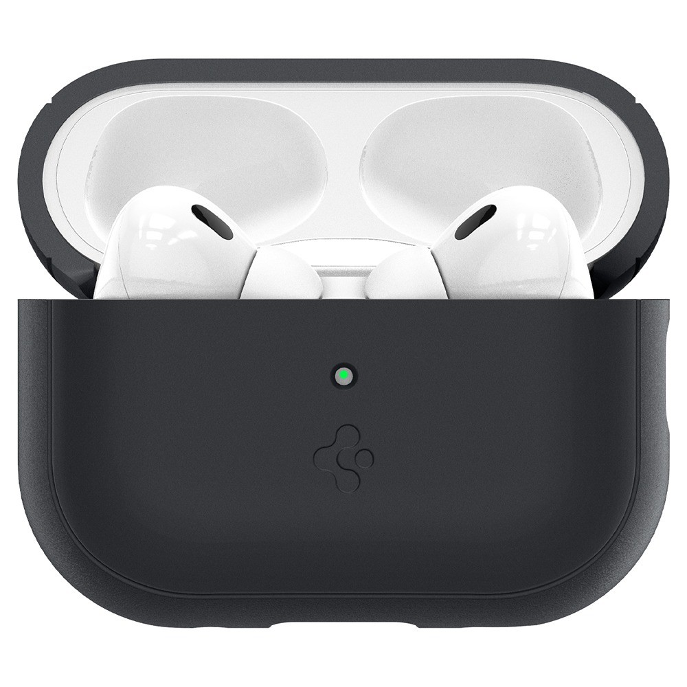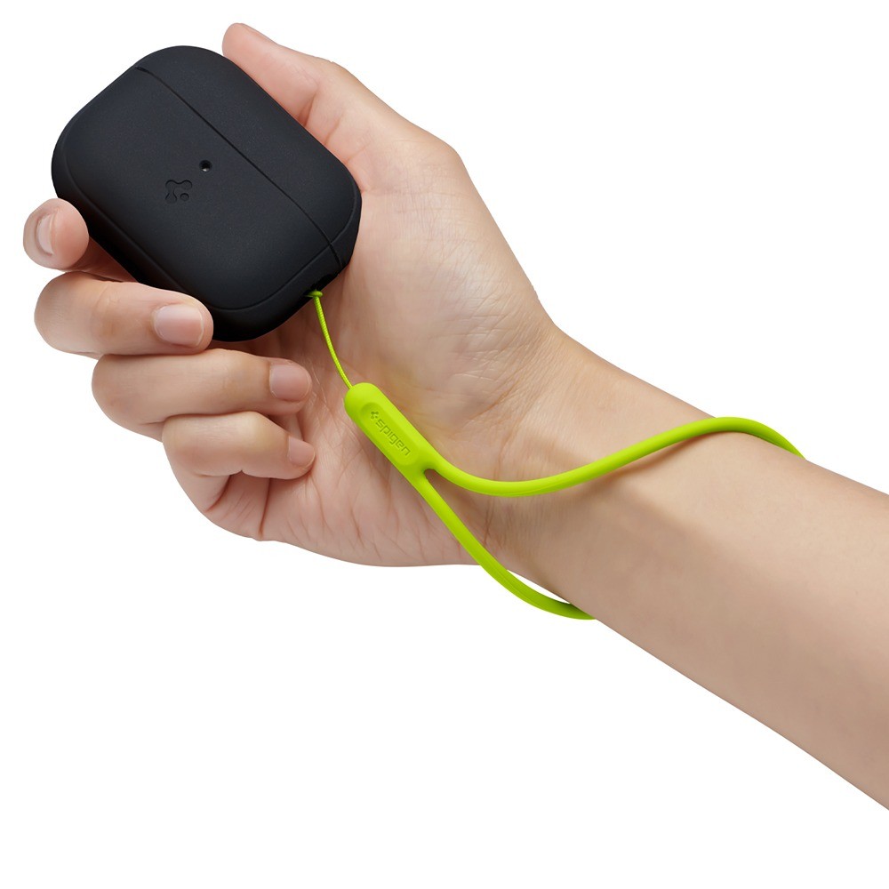 Spigen AirPods Pro 2 Skal Silicone Fit + Strap Sort er et sort og grønt mobilcover til Apple AirPods Pro 2.