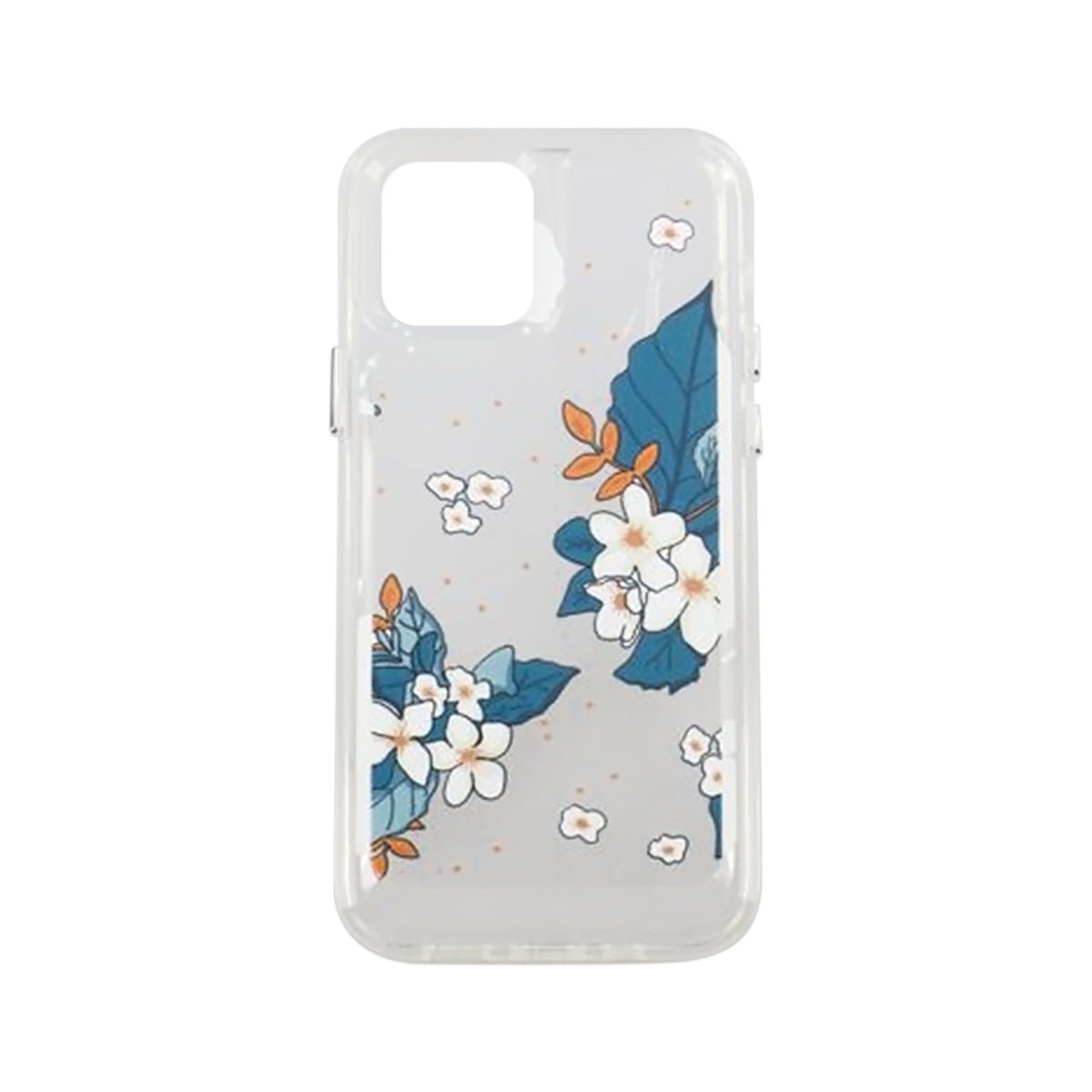 Dette iPhone 12/12 Pro mobilcover er et elegant og beskyttende mobilcover, der viser et motiv med blå-hvide blomster med orangefarvede blade i en kunstnerisk udførelse.