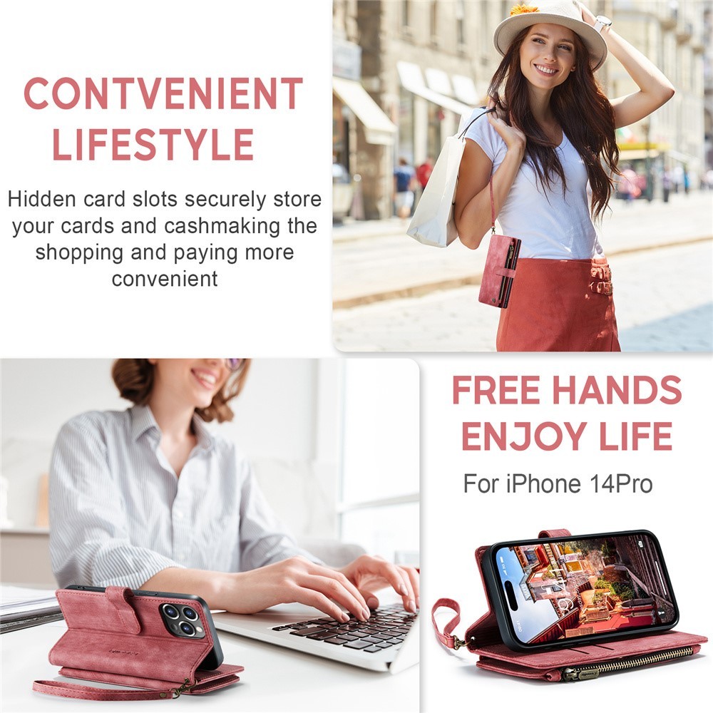 Etuiet fungerer som en mobilpung med kortlommer til kort og kontanter. På ydersiden er der også en lynlås til ekstra opbevaring, for eksempel sedler eller småting.