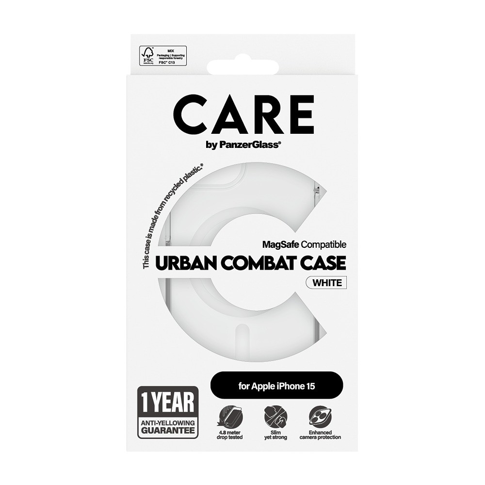 CARE by PanzerGlass iPhone 15 Skal Urban Combat MagSafe Hvid er en hvid og gennemsigtig mobilbeskyttelse til iPhone 15.