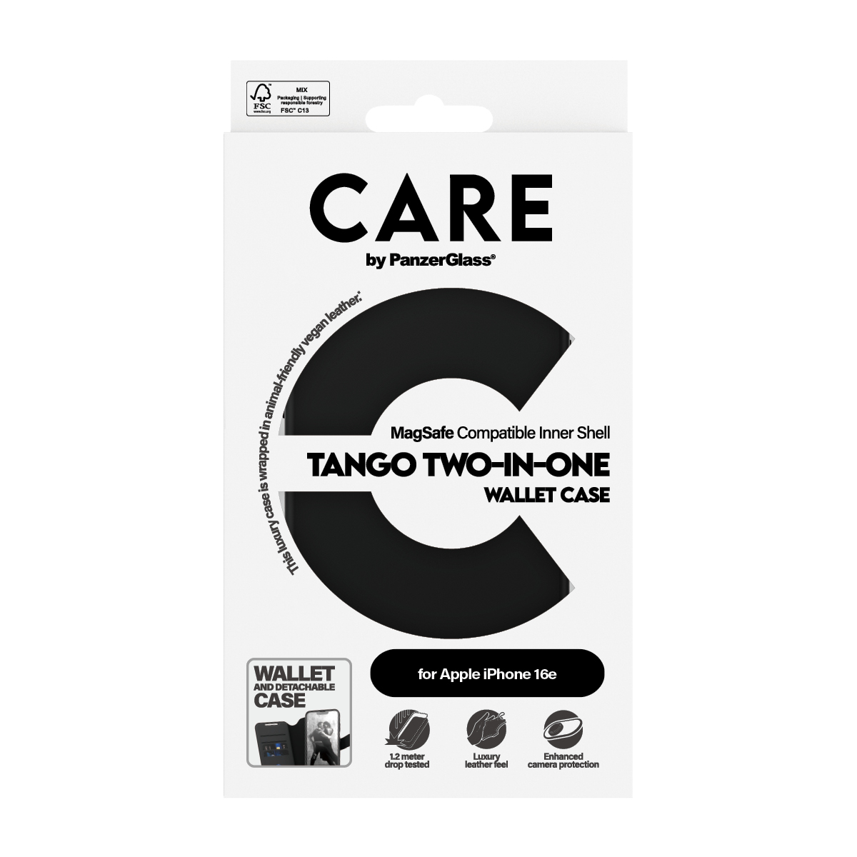 CARE by PanzerGlass iPhone 16e/17e Fodral Tango Two-in-One Wallet MagSafe Sort er et sort mobilcover til iPhone 16e/17e.