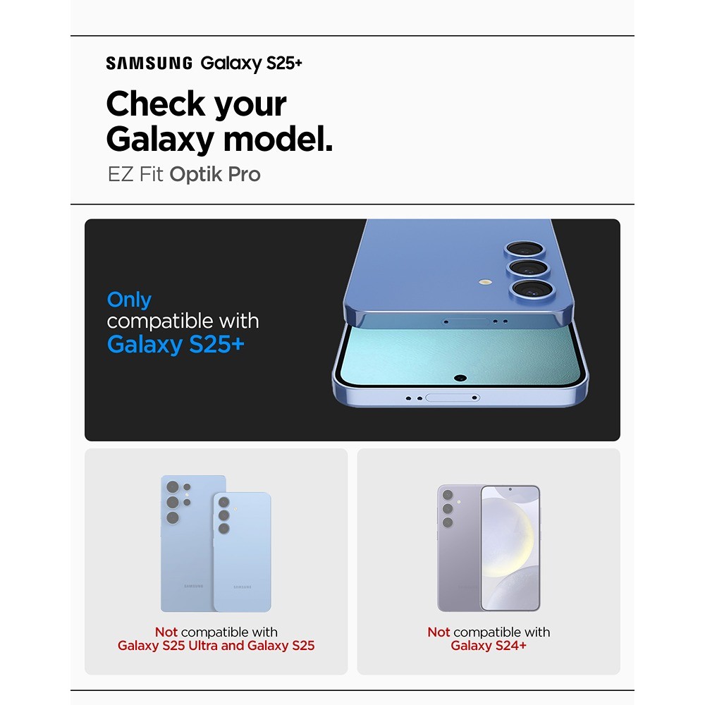 Spigen Samsung Galaxy S25 Plus kameralinsebeskyttelse GLAS.tR EZ Fit Optik Pro 2-pack Svart er en sort og gennemsigtig kameralinsebeskyttelse til Samsung Galaxy S25 Plus.