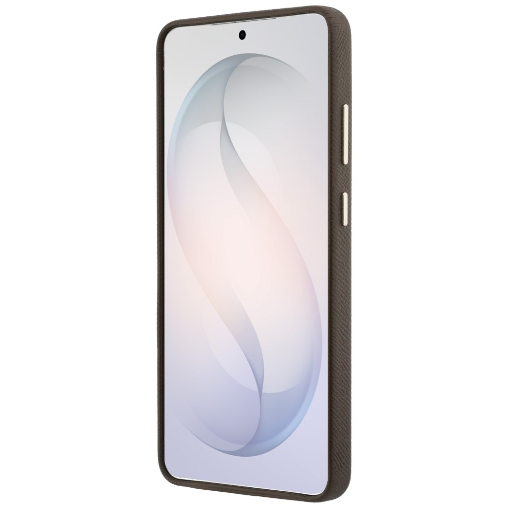 Konstruktionen kombinerer blød plast (TPU) i selve rammen med hårdplast (PC) på bagsiden, betrukket med kunstlæder, hvilket giver en holdbar bagbeskyttelse med en behagelig grebsfornemmelse.