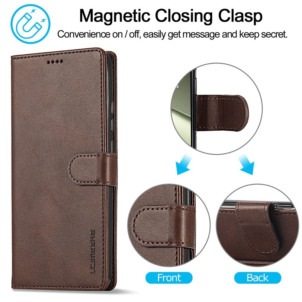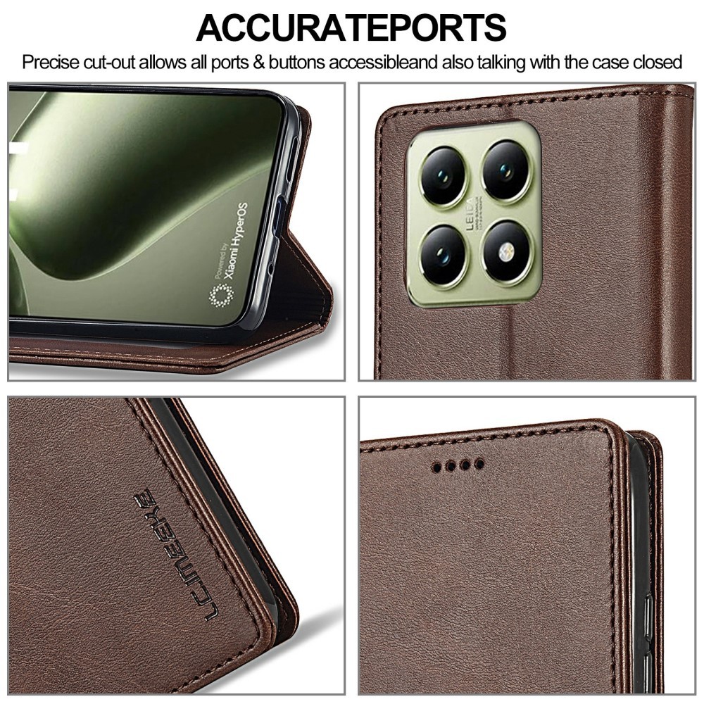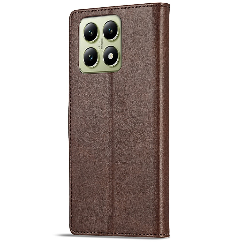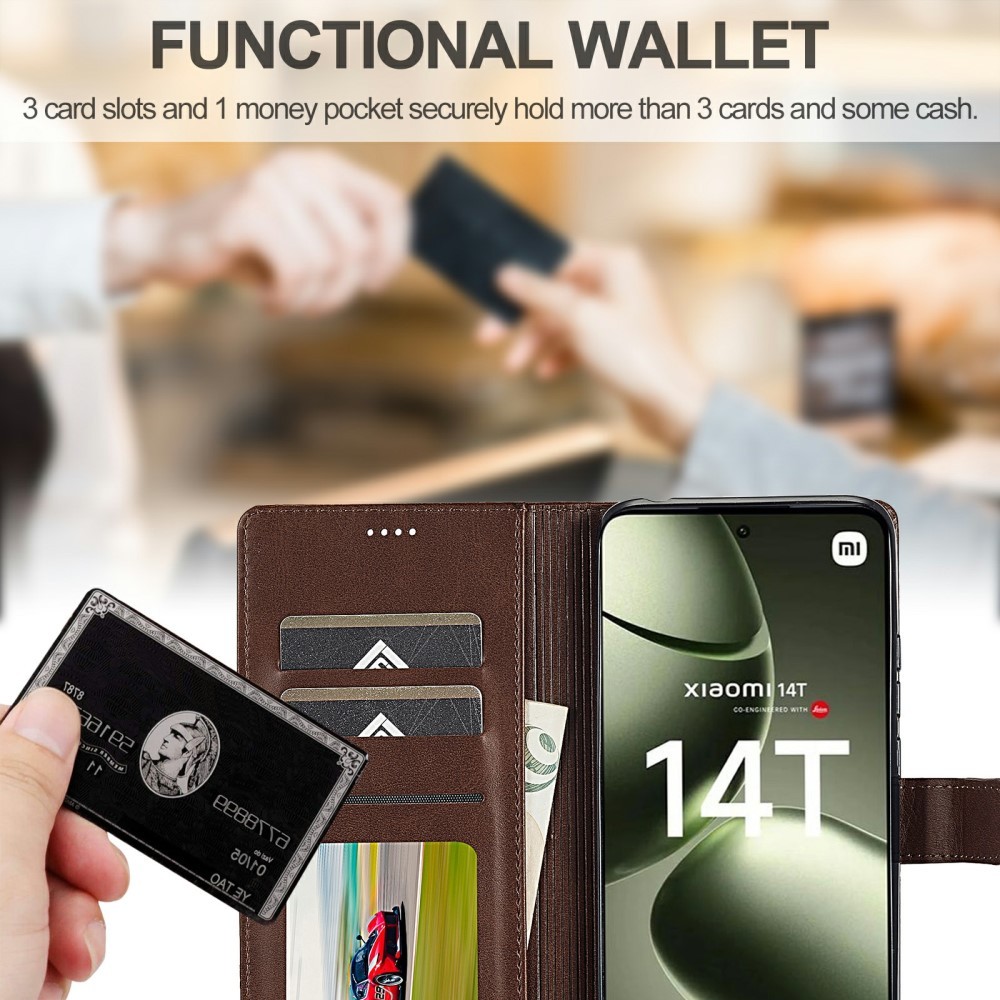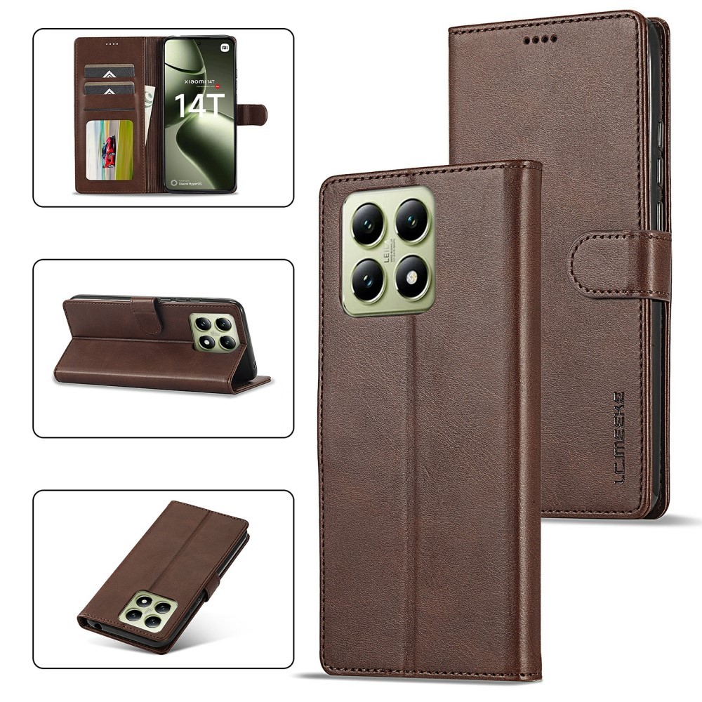 LC.IMEEKE Xiaomi 14T etui med kortlomme og stativfunktion, mørkebrun är et brunt mobiletui til Xiaomi 14T.