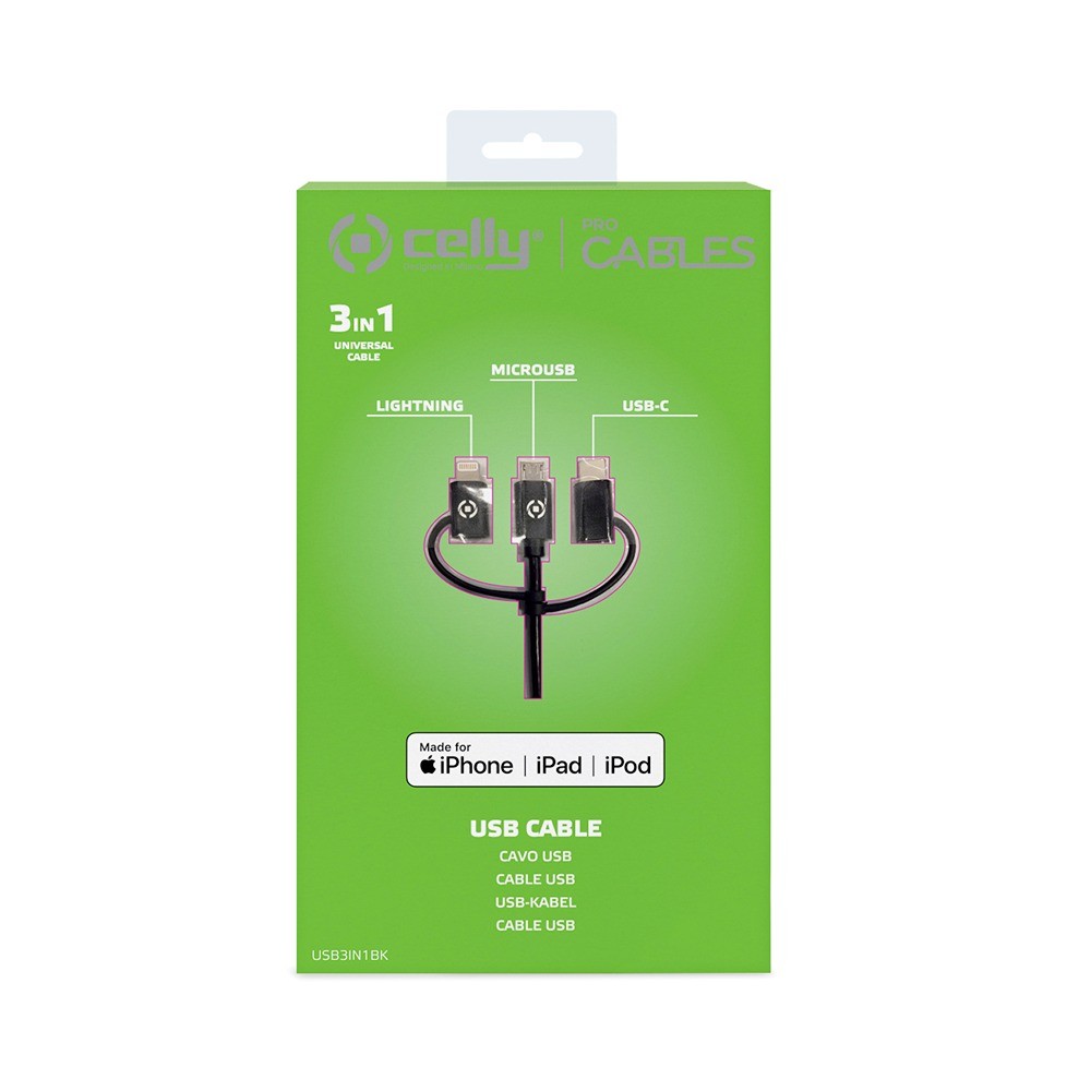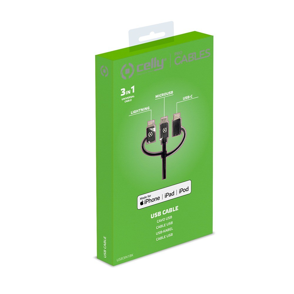 3-i-1 universalkabel med Micro USB og adaptere til Lightning (MFI) og USB-B.
