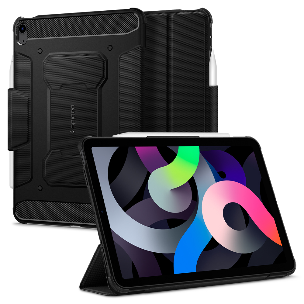 Spigen iPad Air 10.9 2020/2022-etui Rugged Armor Pro Sort er et sort etui til iPad Air 10.9 (Gen 4/5).
